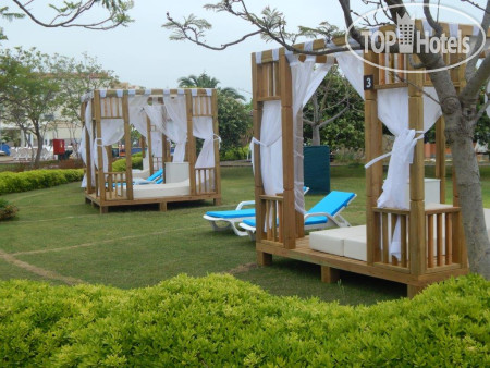 Территория отеля большая и зеленая, очень ухоженная, кусты и лужайки идеально подстрижены, растут гранаты, лимоны, магнолии, фикусы Бенджамина, туи, лавр, гибискусы, даже платаны и многое другое. Красота для глаз, каждый день любовались. На пляж ведет тенистая аллея из фикусов. По всей территории стоят шезлонги: около бассейнов, под деревьями, места всегда есть.