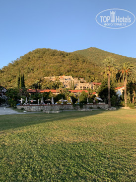 Территория шикарная, даже со своим древним действующим храмом и музеем, с видом на замок принца Ольденбургского. За территорией отеля большой Приморский парк, так что погулять есть где.