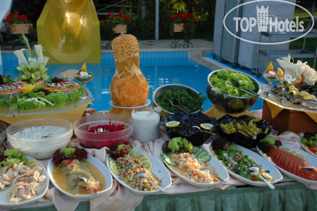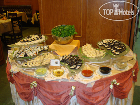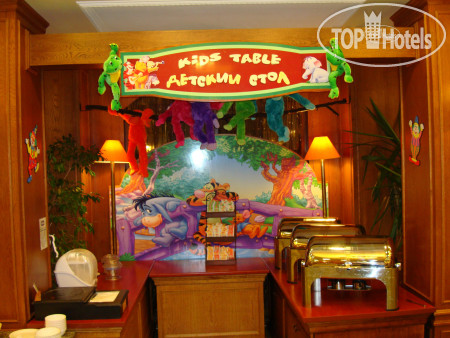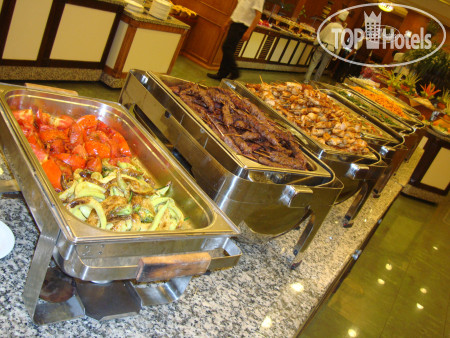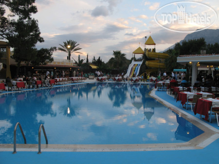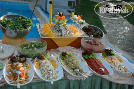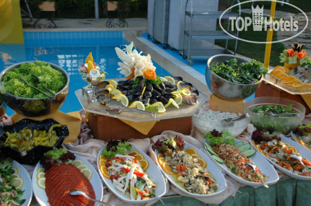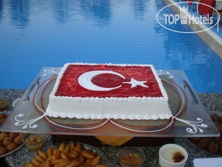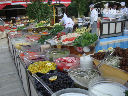 Ресторан: обилие разнообразной еды (индейка, рыба были всегда, баранина, говядина в различных вариациях; из гарнира рис, макароны, овощи запеченные, на гриле; супы, зелень, салаты, различные соусы, масла на выбор; десерты-это отдельная тема: от пахлавы минимум 3 видов до тортов, йогурты. Утром-яйца (омлет, штучное), каши (правда, слишком сладкие), халва, орехи, сыры. Из напитков стабильно брали чай, хотя есть и кофемашина, и соки (однако за свежевыжатые отдельная плата 3 евро)). Вода всегда в достаточном количестве практически на каждом углу: как в бутылках, так и в небольших пластиковых стаканах. Из фруктов всегда были арбузы, яблоки, сливы, персики, апельсины, какое-то время выносили грейпфрут. На улице на каждый приём пищи готовили что-нибудь новое (морепродукты, суши, шаурма, лепешки; на завтраки всегда были блины, панкейки, булочки). Также была отдельная детская стойка с макаронами, гречкой/брокколи, варёной индейкой (так получилось, что в предпоследний день неважно себя чувствовала и ела щадящую пищу детского питания. Удивилась, почему дети толком не едят оттуда: самый раз для желудка... В общем, голодными точно не останетесь в любой ситуации). Хочется выразить искреннюю благодарность работникам кухни и ресторана, особенно Джафару за чуткое, внимательное отношение. В зависимости от тематического вечера были и новые блюда: лазанья, запеченный картофель с сыром, жареная рыба и т.д.). 1 раз можно сходить в рыбный ресторан а-ля карт. Очень понравилось как обслуживание, атмосфера, так и еда: за день записываешься на ресепшен и на ужин отправляешься. Всего 6-7 столиков, уже накрыты ( закуска, сыры, орехи, разливают белое вино), затем выносят основное блюдо-красная рыба с грибами. На десерт принесли торт "Наполеон", чай, завершающей частью трапезы стала свежая крупная спелая клубника. Обязательно рекомендую посетить.