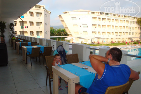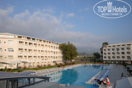 В пятёрках отдыхаю редко тк зачастую не с кем ехать, а одной жить в пятёрке это накладно... Эта с виду красивая, корпуса в виде корабликов, расположение корпусов в принципе удобное. Стоит отель на отшибе, около дороги,удобно что прямо рядом остановка, чтобы поехать в сам Кемер на автобусе тк расположен отель в посёлке Кириши в 15- 20 минутах от Кемера. Заселение было позже 12 тк что то у них не срасталось и многие люди стояли и жаловались, например, женщина возмущалась что с ребёнком, а их не заселяют... Вай фай у них только в зоне ресепшена, в номерах не ловит от слова совсем, на пляже тем более... Сам номер старенький но жить можно, нам достался с видом на бассейн и частично на второй этаж столовой... До пляжа нужно идти минут пять через аквапарк, который можно посещать бесплатно от отеля, но я его не посещала тк катастрофически боюсь этих горок, да и тащить подушку надувную наверх по лестницам не самый хороший вариант... Сам пляж с мелкой галькой и нужны акватапочки тк заходить в море больновато особенно, когда тебя шатают волны. Лежаков всегда было предостаточно, сам пляжный отсек отеля тоже крайний и дальше только местные тусуются... Есть рядом какое то болото с птицами. Бар и тусовочный отсек на пляже не впечатлил, понятное дело очереди постоянно. В самом отеле еда на любой вкус, но во всех отелях она в принципе одинаковая рис, картошка фри, салаты, овощи, фрукты, булки, пироженки итд. Несколько раз давали красную рыбу. Еда понравилась, но я непривиредливая и всегда найду, что покушать. Очень нравились завтраки блинчики, омлет. По погоде было невыносимо жарко тк отдыхали в июле, а я имею склонность обгорать и поэтому вся обгорела, хоть и находилась на пляже ло 11 утром и потом только после 16.В бассейне проводилась аквааэробика, в принципе неплохо, но девушка говорила не по русски... В выходные приезжало много местных в платках и какие то детские футбольные команды, что очень не понравилось тк дети в столовой вечно бегали орали и создавали очереди. Поэтому на втором этаже открыли вторую столовую, где была таже еда но пройти можно было тем, кто без детей....Про анимацию сказать ничего не могу тк не любитель подобного, но вроде играли песни ласкового мая.. В целом как вариант отдыха неплохо, но второй раз бы не поехала.